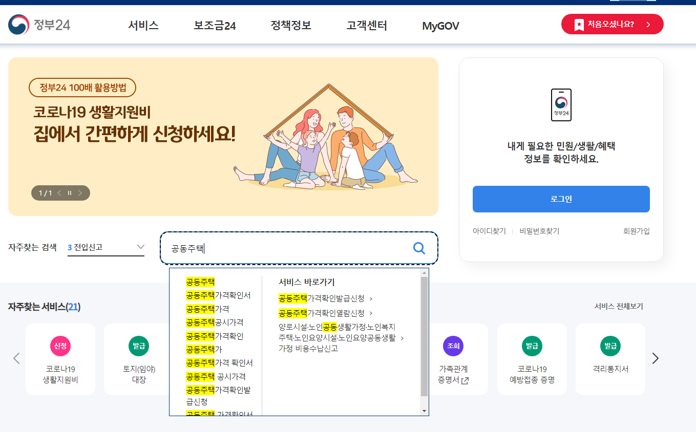 2. 정부24 검색창에 공동주택을 검색하면 '공동주택가격확인발급신청' 서비스 접속