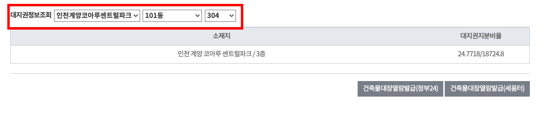 4. 클릭을 하고나면 [ 대지권정보조회 ] 가 생성되는데 원하는 정보를 넣어주면 해당 대지권지분비율이 생성됩니다.