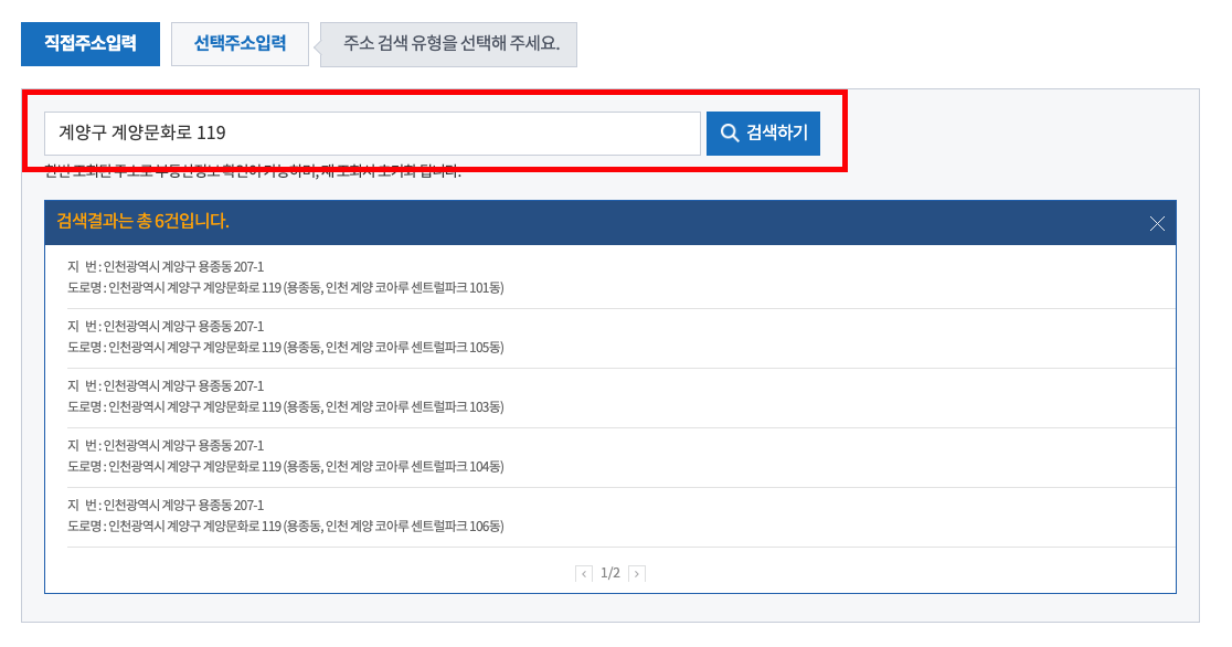 2. 원하는 아파트의 주소를 입력합니다. 그 중에서 원하는 정보를 클릭해서 들어갑니다.