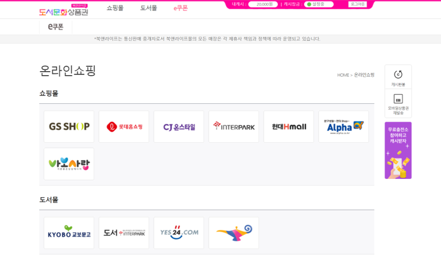 온라인쇼핑 또는 도서몰에서 이용 가능>원하는 곳 클릭