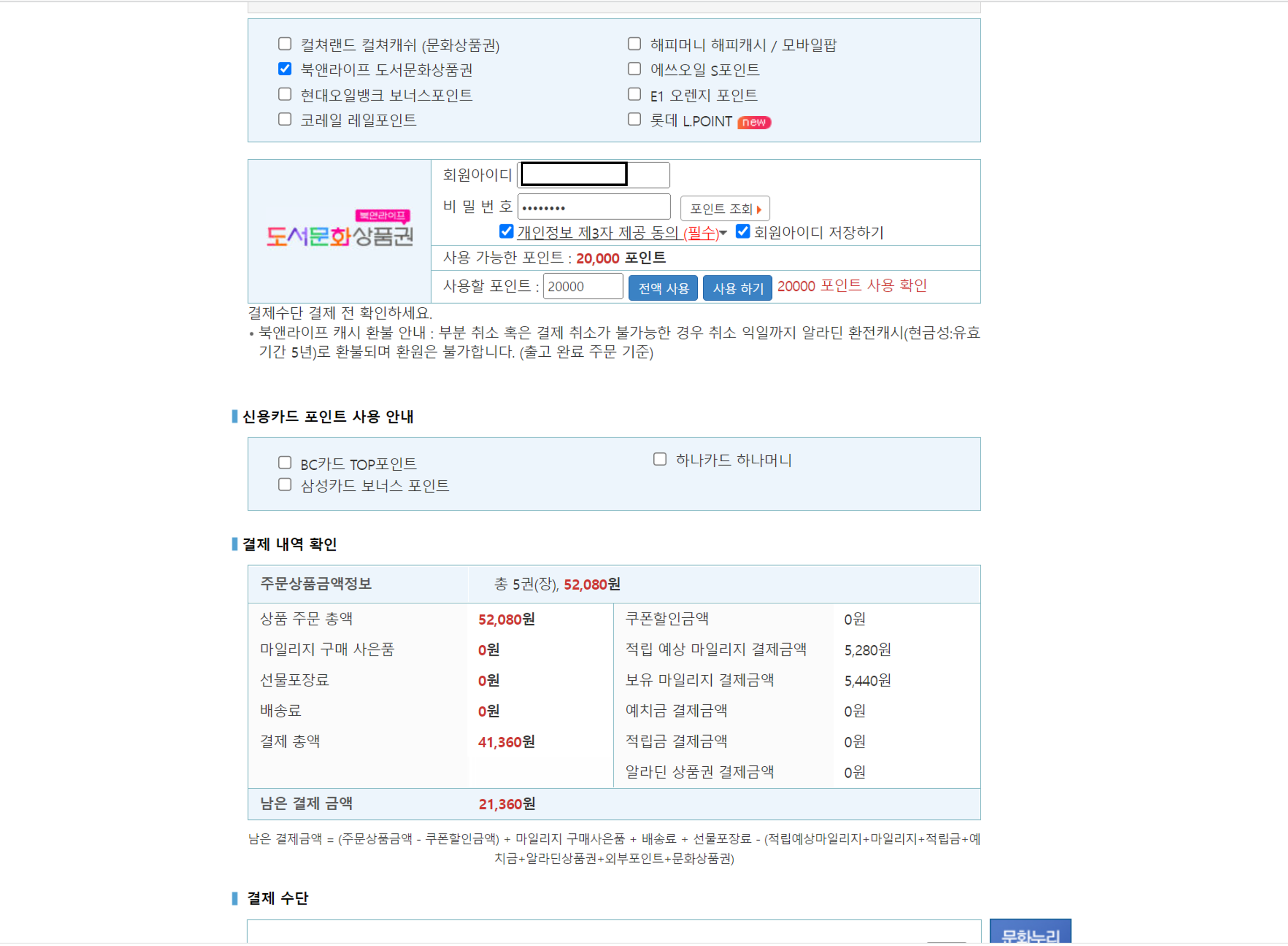 구매를 원하는 책을 장바구니에 넣기>결제 화면에서 북앤라이프 도서문화상품권 클릭하기>도서문화상품권 사이트 아이디,비밀번호 입력하기>사용할 포인트 입력하기