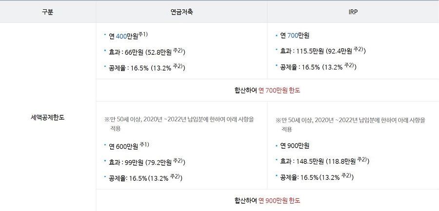 먼저 세액공제 부문을 살펴보면요. 두 계좌 모두 1인당 납입한도는 1800만원으로 동일합니다. 다만 다른 점이라면 세액공제 대상 금액이 IRP는 700만원, 연금저축 계좌는 400만원까지 가능합니다. 다만 여기서 한도를 공유해요. 즉 연금저축 계좌 400만원을 받는다면 IRP는 300만원까지만 세액공제를 받을 수 있습니다. 즉 IRP로 700만원을 받아도 되고요. 두 계좌를 모두 운용하려면 IRP 300만원, 연금저축 400만원 이렇게 운용할 수 있겠죠.