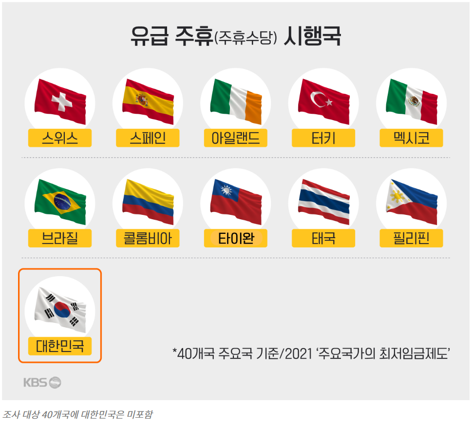 고용노동부 소속 최저임금위원회가 매년 발표하는 '주요국가의 최저임금제도' 자료에 따르면 지난해 40개 주요국(OECD 회원·비회원국, 한국은 제외) 중 우리처럼 주휴수당을 주는 나라는 10곳이었습니다.