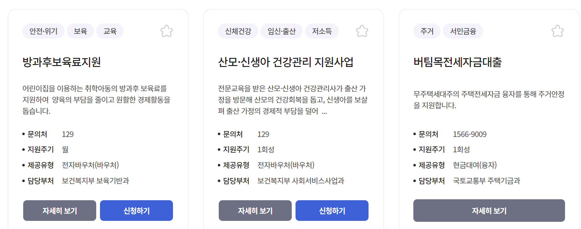 3. 인터넷으로 신청이 가능한 항목과 함께 자세히 보기 항목이 뜹니다. 지원하고 싶은 항목에 맞춰 클릭하면 됩니다.