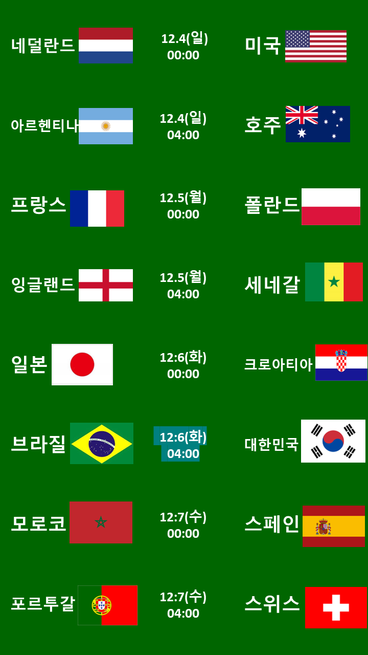 아르헨티나-호주(4일 오전 4시), 프랑스-폴란드(5일 0시), 잉글랜드-세네갈(5일 오전 4시), 일본-크로아티아(6일 0시)전, H조 2위로 16강에 진출한 한국은 6일 오전 4시에 FIFA 랭킹 1위이자 이번 대회 가장 강력한 우승 후보 브라질과 격돌합니다.