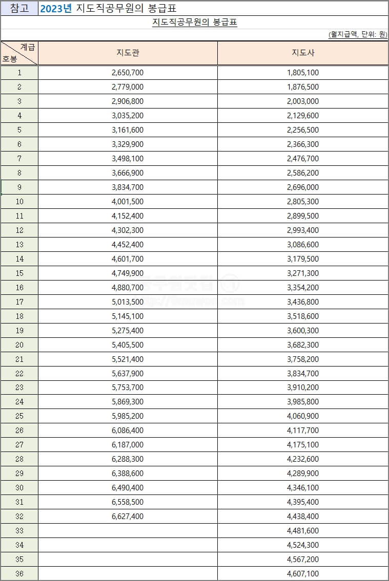 2023년 지도직 공무원 봉급표입니다. 지도사 1호봉은 1,805,100원, 2호봉은 1,876,500원, 3호봉은 2,003,000원입니다. 지도관 1호봉은 2,650,700원, 2호봉은 2,779,000원, 3호봉은 2,906,800원입니다.