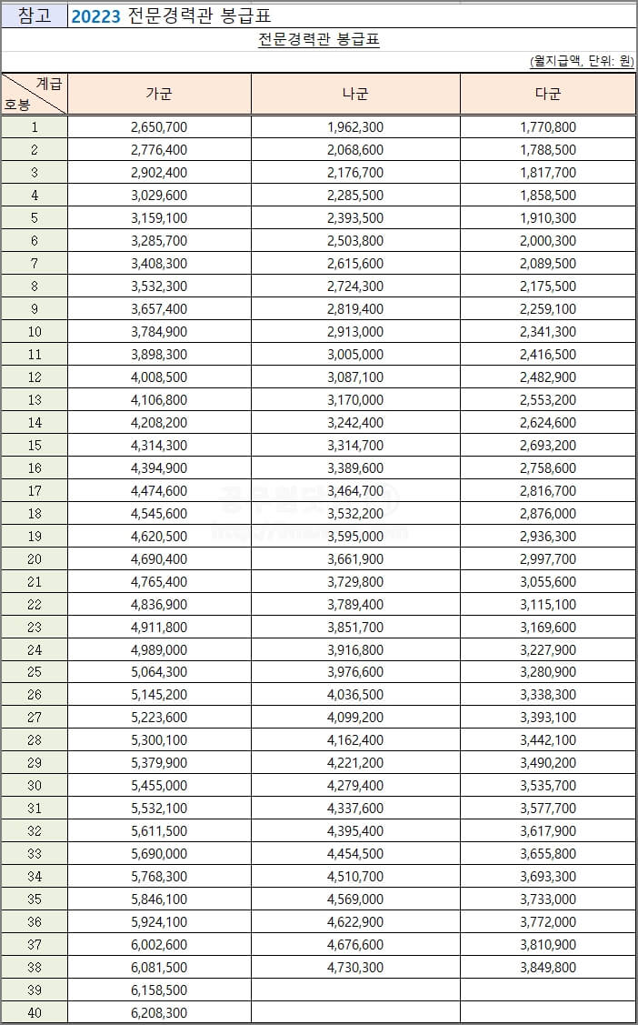 2023년 전문경력관 봉급표입니다. 다군 1호봉 1,770,800원이며, 나군 1호봉은 1,962,000원입니다. 가군 1호봉은 2,650,700원입니다.