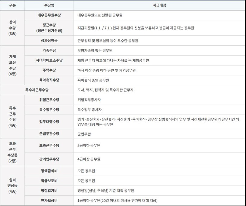 상여수당은 성과상여금, 정근수당, 대우 공무원 수당으로 나뉩니다.