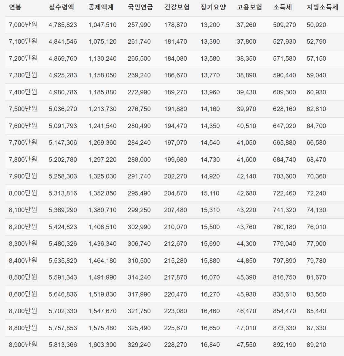| 국민연금 | 건강보험 | 장기요양 | 고용보험 | 소득세 | 지방세 |