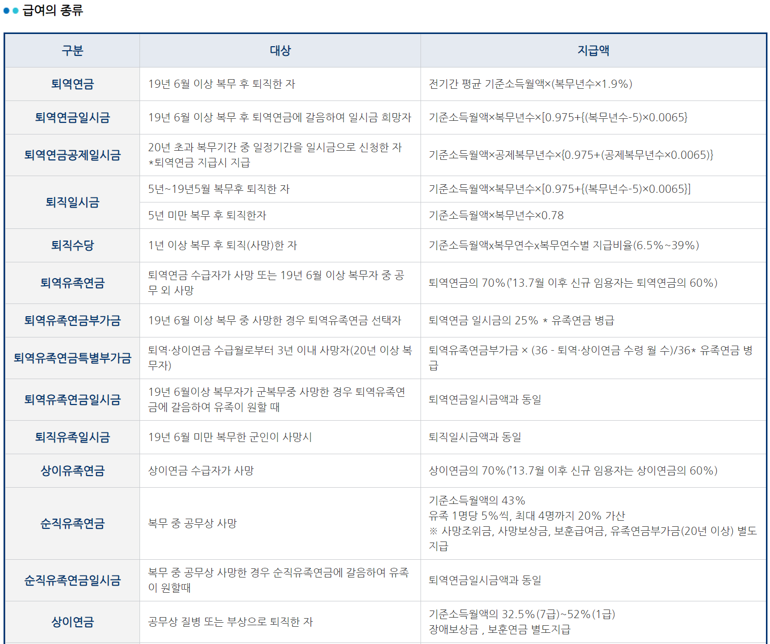 | 2. 퇴직수당 | 1년 이상 복무 후 퇴직하는 군인에게 지급 |